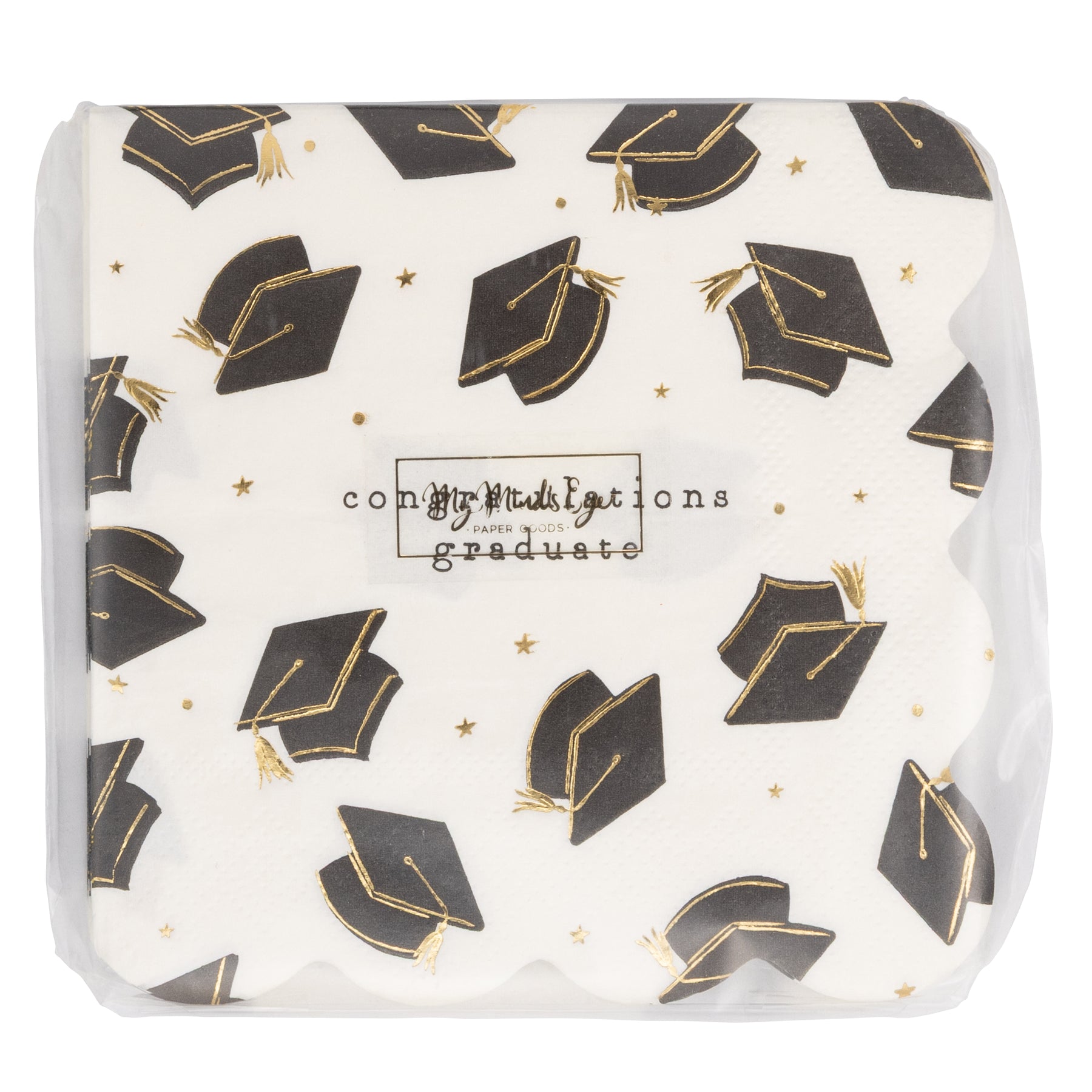 • Grad Hat Pattern paper cocktail napkins in black on cream with "CONGRATULATIONS GRADUATE" imprint
