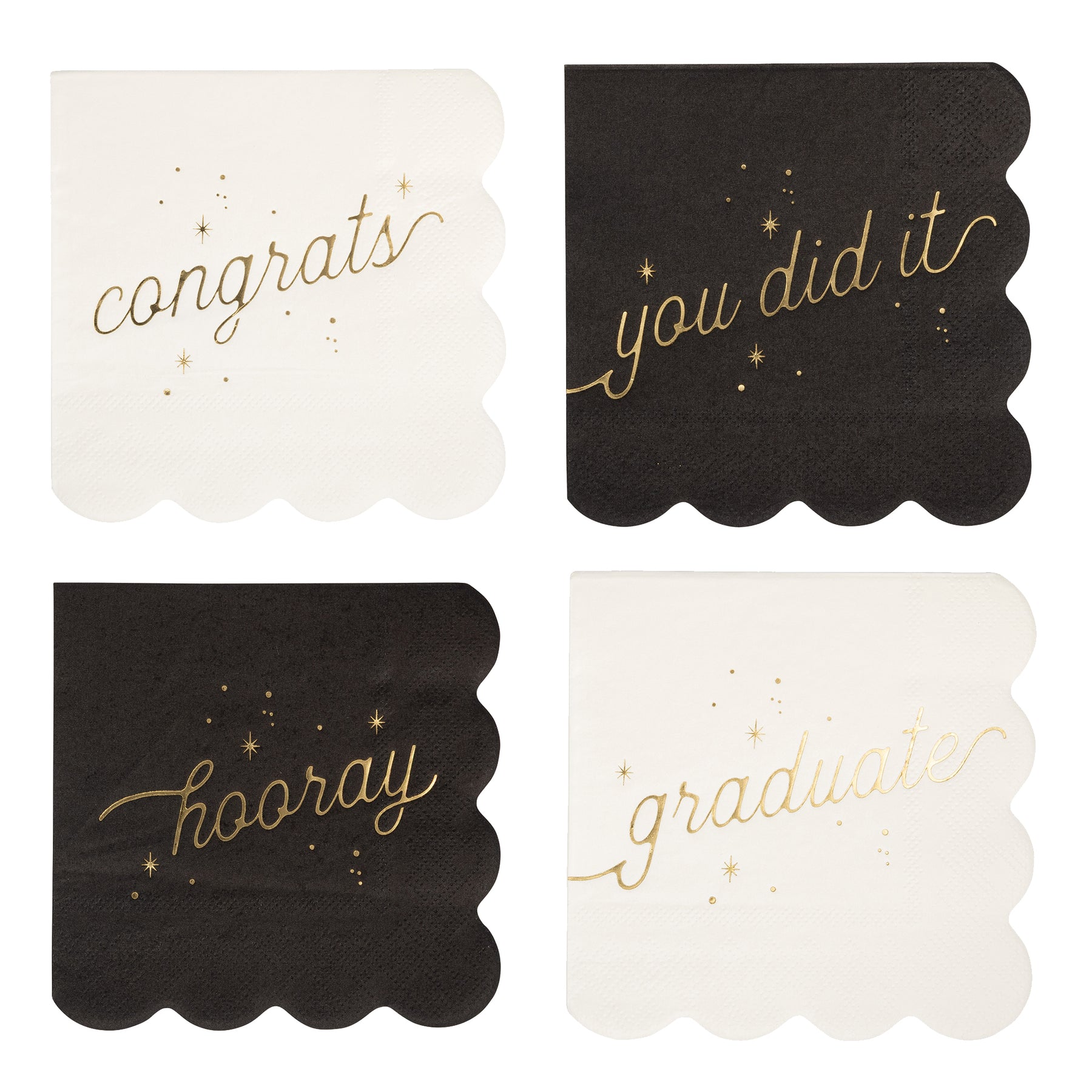 • Set of 16 napkins, 4 each of the following designs: "CONGRATS," "HOORAY," "GRADUATE," and "YOU DID IT"