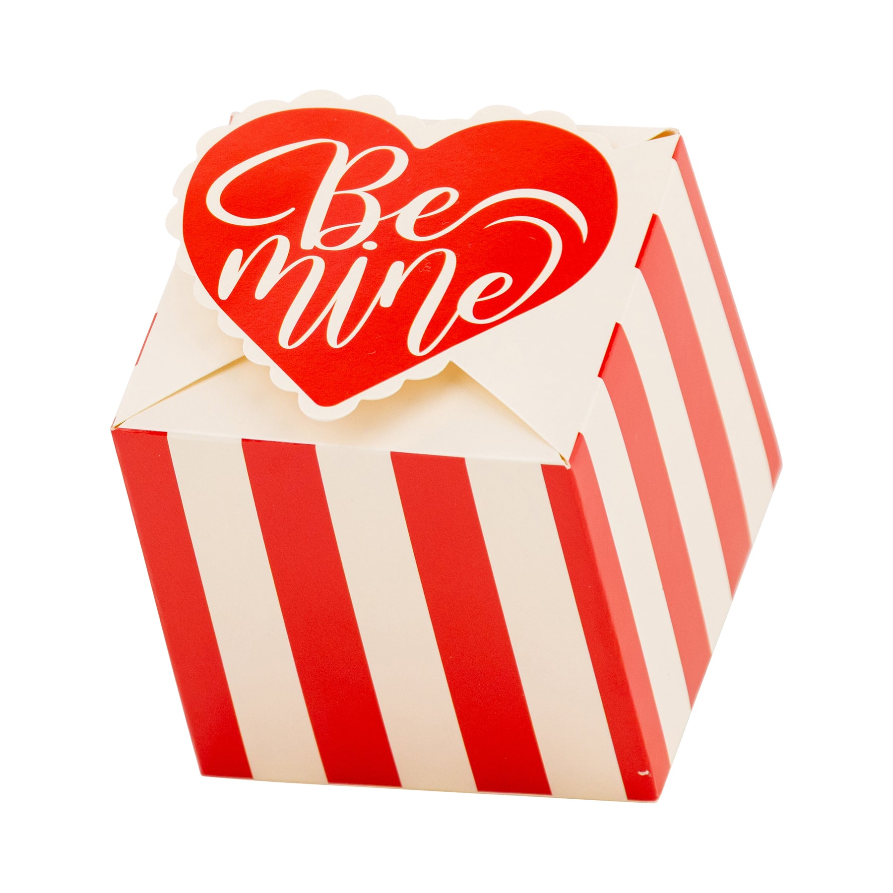 • Red and cream "BE MINE" scalloped heart design with red and cream striped box panels