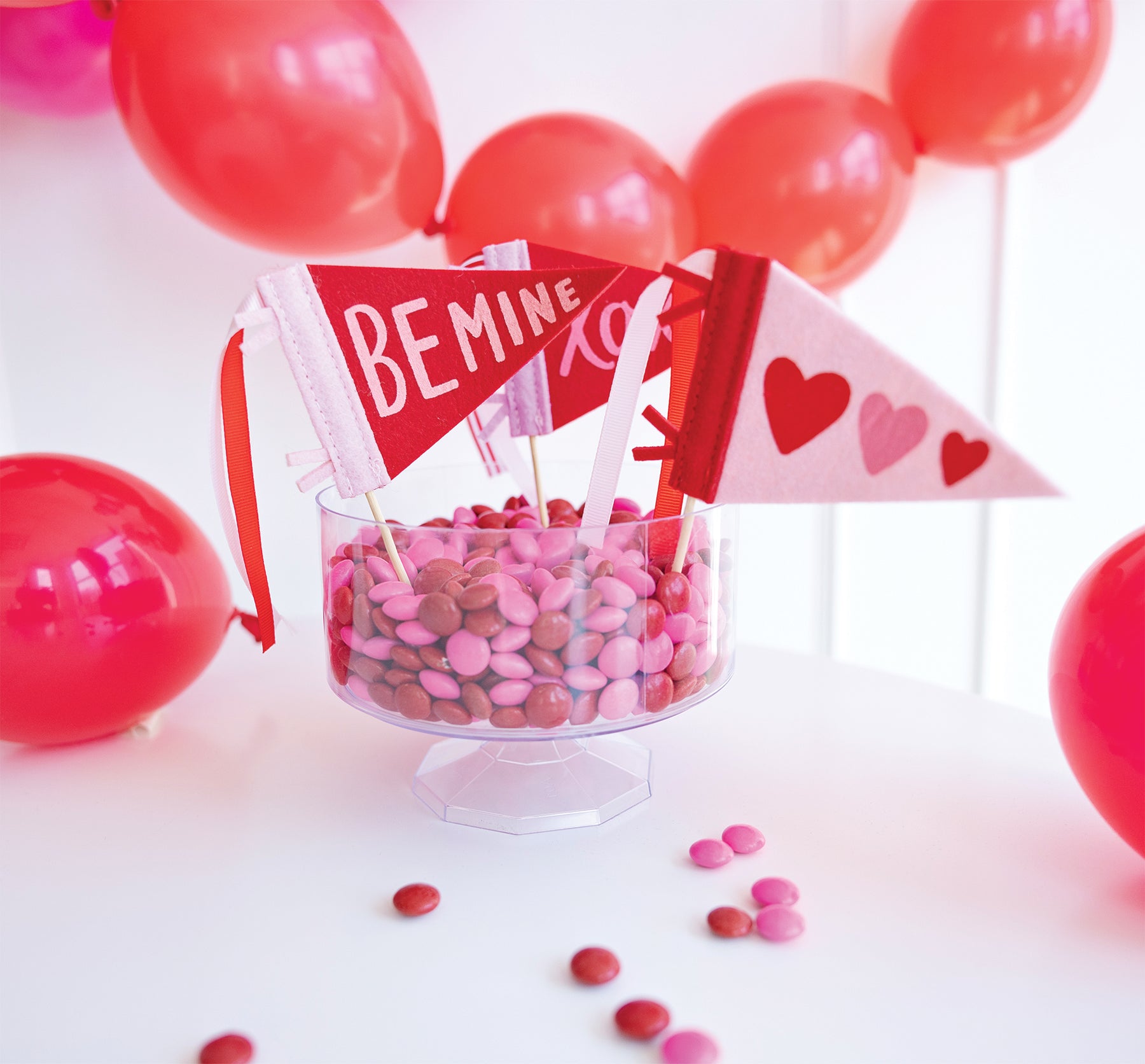 • Two 6" long red, pink, or white-and-cream striped ribbons attached to the top of each pennant