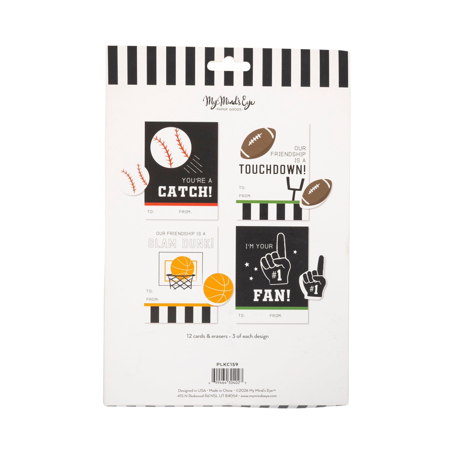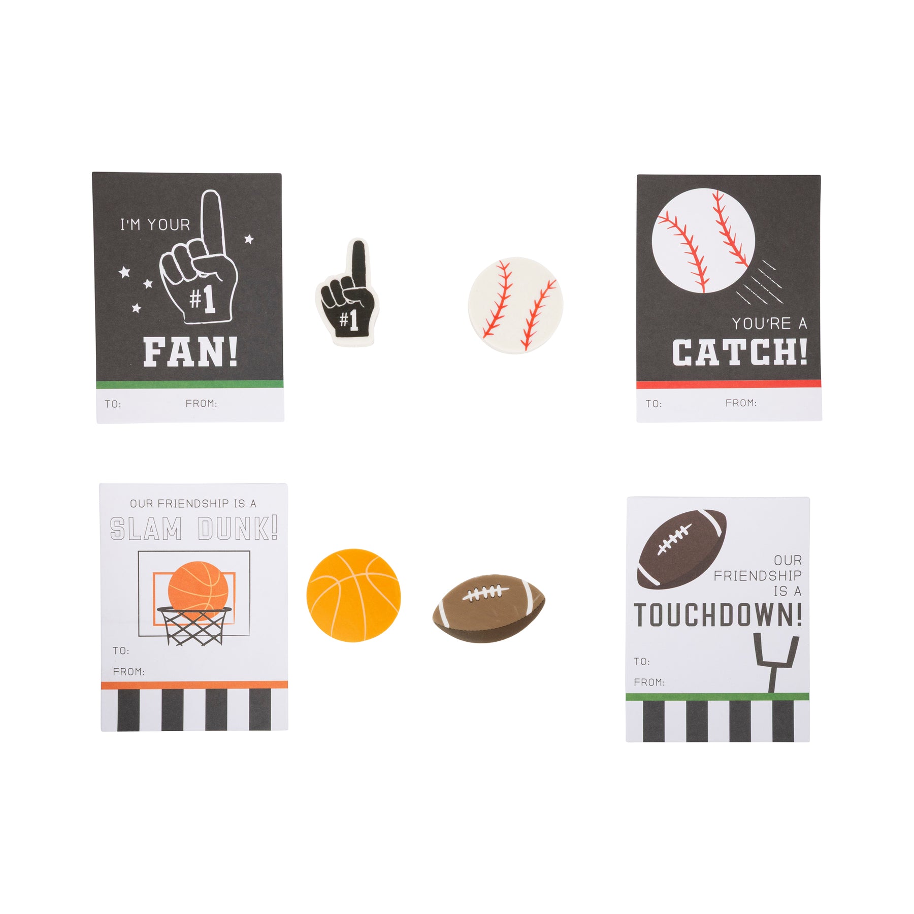 • 12 paper cards included, 4 different designs: "YOU'RE A CATCH" (baseball), "OUR FRIENDSHIP IS A TOUCHDOWN" (football), "OUR FRIENDSHIP IS A SLAM DUNK" (basketball), and "I'M YOUR #1 FAN"