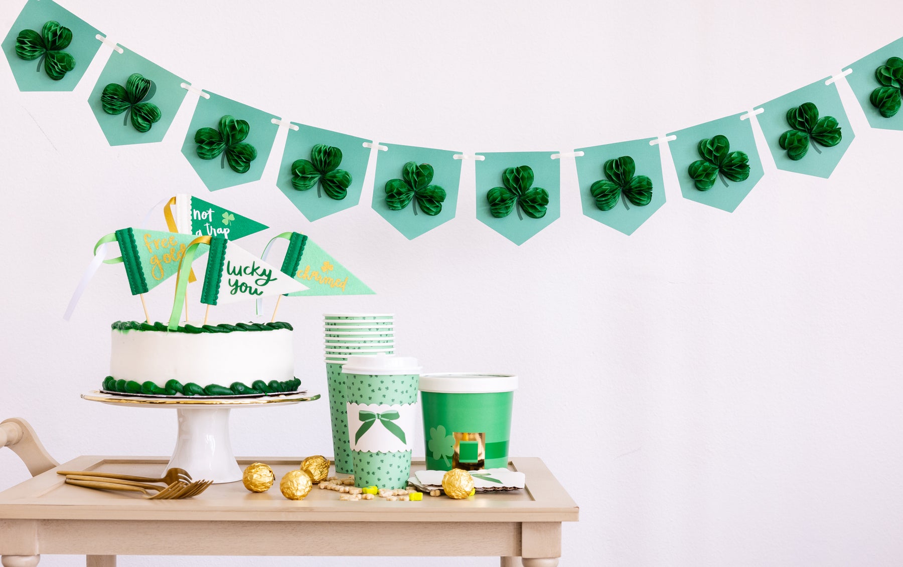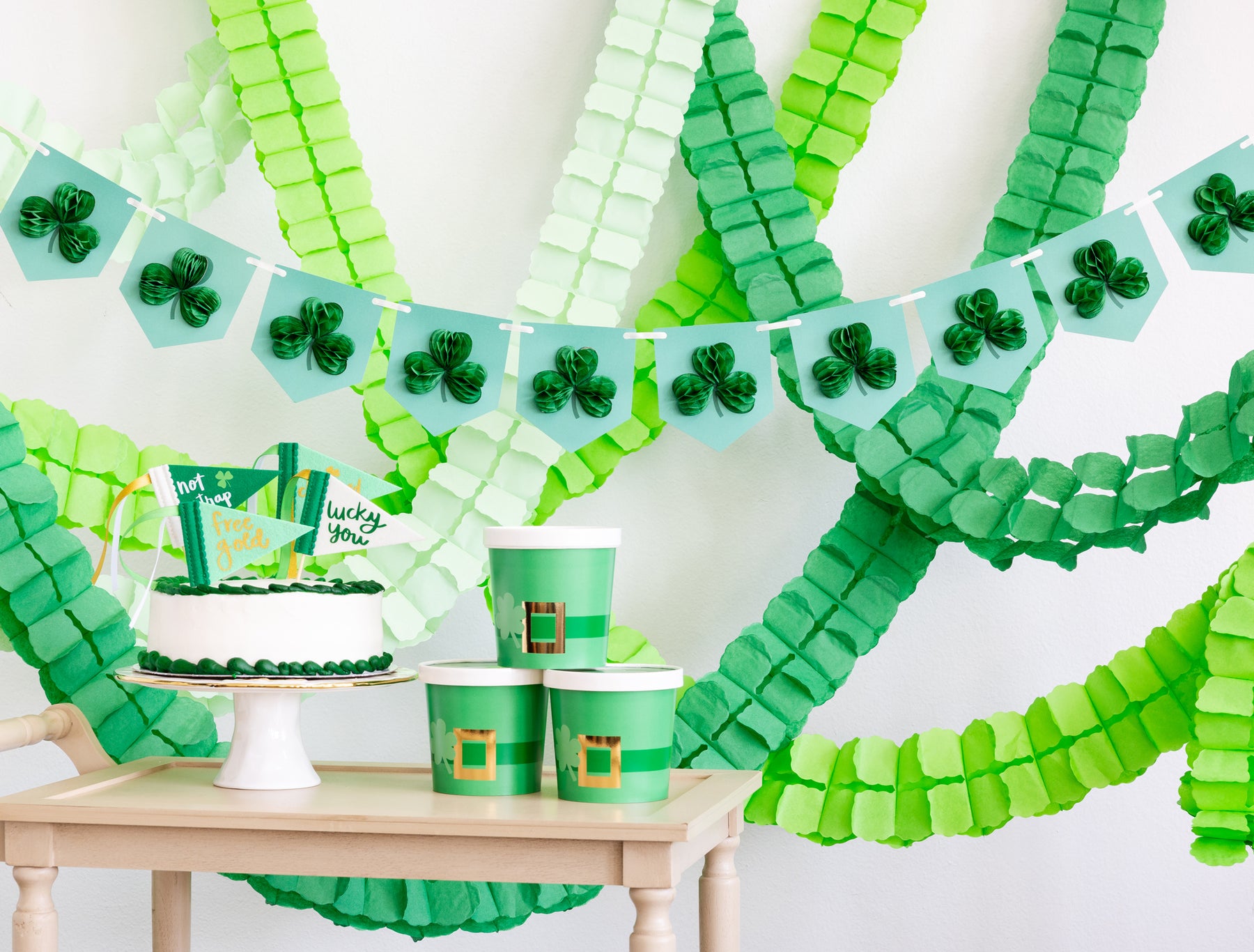 • 10 honeycomb shamrocks, each approximately 2.8" tall, attached to the banner pieces